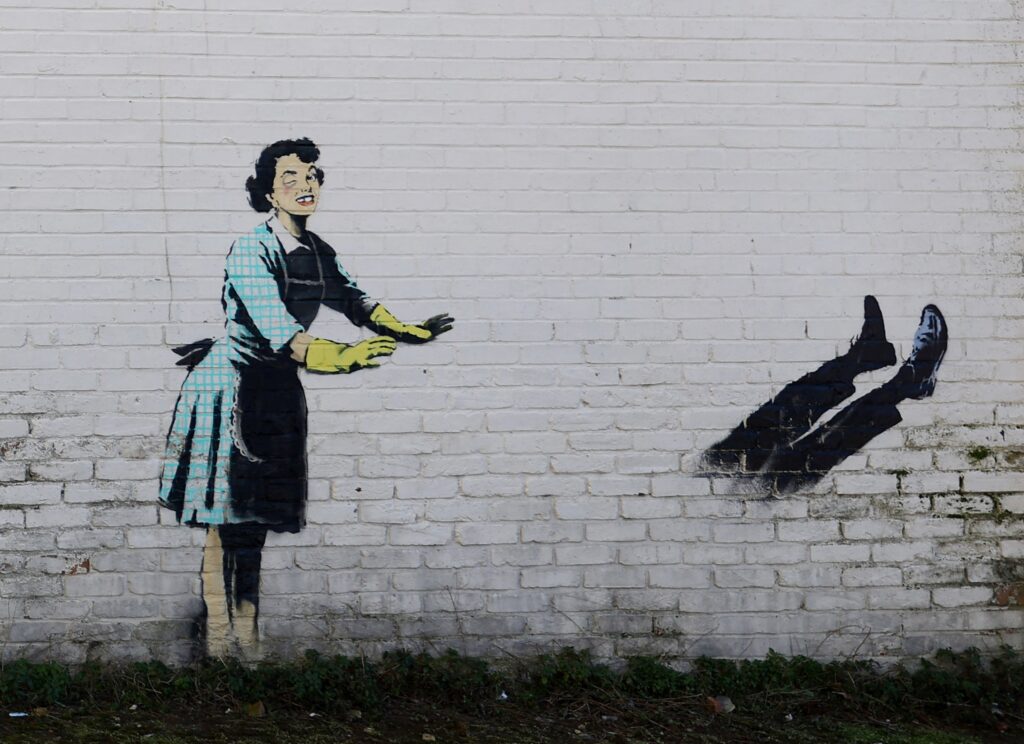 Graffiti zobrazuje ženu v domácnosti z 50. let s podlitinou ve tváři a chybějícím zubem, která patrně zavírá muže do mrazáku.