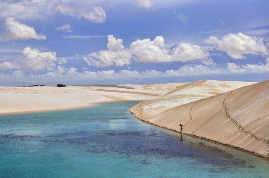 Jméno Lençóis se doslova překládá jako „prostěradla“. Když stojíte na vrcholu zvlněné bílé písečné duny v národním parku Lençóis Maranhenses, toto matoucí jméno najednou dává smysl. Národní park, známý svou pozoruhodnou scenérií, zahrnuje nekonečný úsek písečných dun, jako když někdo jemně třese velkým bílým prostěradlem. Nejlepší čas k návštěvě je po období dešťů, když se propady mezi dunami naplní temně modrými kalužemi sladké vody. Je to krajina jako žádná jiná.