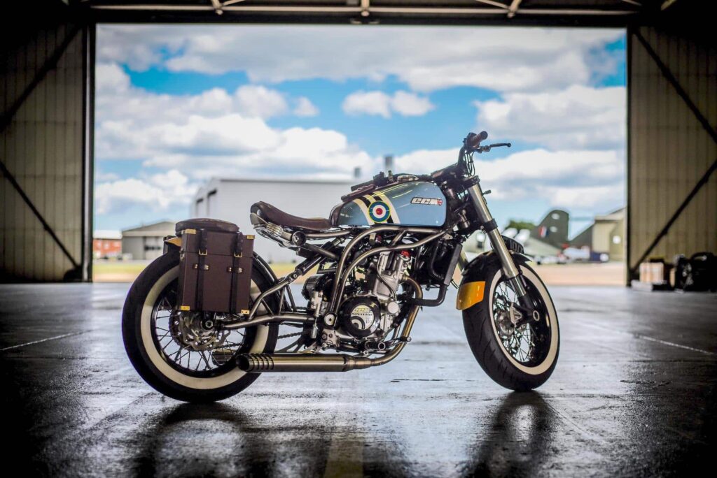 Motorku Spitfire jako takovou už známe, tudíž nás svými výkony a technologiemi příliš nepřekvapí. Co nás ovšem naprosto dostane je design. Od samého začátku až po koncovku výfuku, veškeré prvky se těší kvalitnímu zpracování. Motorka je osekaná od všech přebytečných věcí a zbývá nám tedy pouze rám, jednoválec v něm zasazený, sedlo, pod kterým se vyjímá masivní odpružení. Kola disponují klasickým výpletem a pneumatika typickou kombinací černé a bílé. I tento detail nás přesune do počátku fungování RAF.