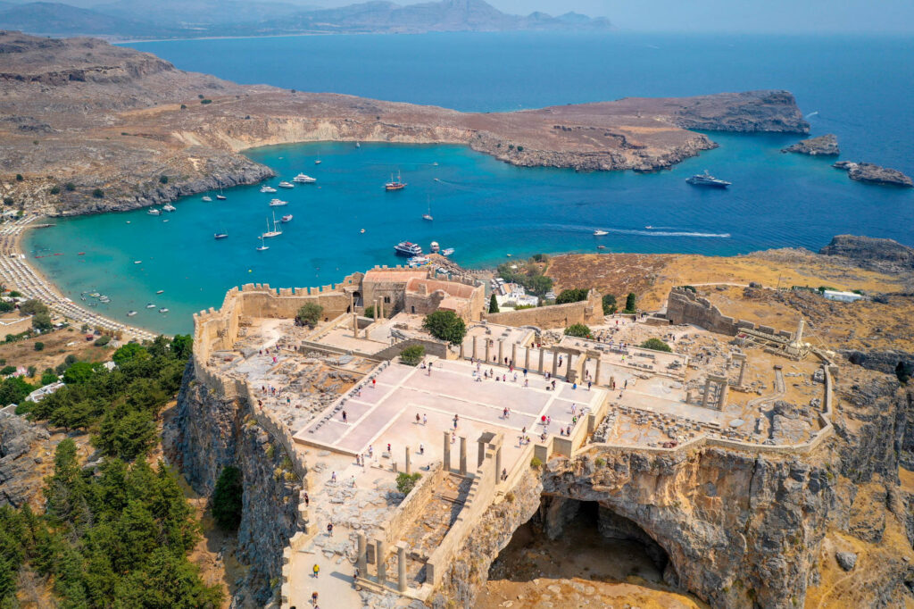Historie citadely však sahá daleko dále. Po strmé pěšině narazíte na loď vytesanou do skály ve 2. století před naším letopočtem. Nahoře je chrám Athény Lindie, který byl postaven ve 4. století před naším letopočtem, rozpoznatelný díky jeho dórským sloupům. Výhled z Akropole ve výšce 116 metrů nad mořem je úchvatný.