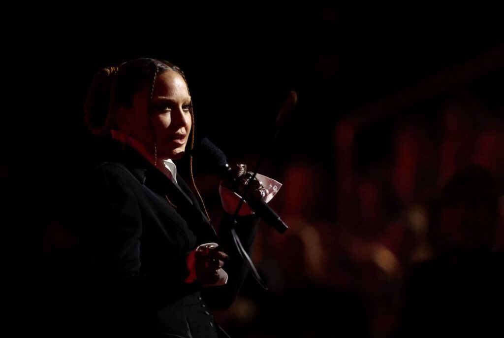 Zpěvačka přišla uvést na pódium zpěváky Kim Petras a Sama Smitha. „Jste připraveni na trochu kontroverze?“ Varovala rovnou publikum a mávala u toho koňským bičem. Pak si vyhrnula šaty s rozparkem, aby ukázala nožku v síťovaných punčochách. Rovnou zacílila na „rebelství“ v hudebním průmyslu. Otevřeně nepřímo přiznala, že její výstřednosti hraničící se zdravým rozumem jsou promyšlený způsob, jak si spolehlivě udržet popularitu. A pochválila za to i nominované kolegy.
