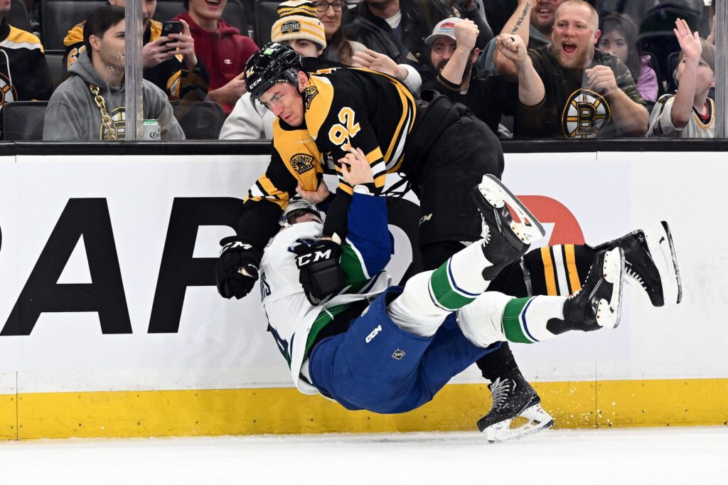 Kyle Burroughs delivers a hit on David Pastrnak — and Tomas Nosek gets into a scrap with Burroughs.