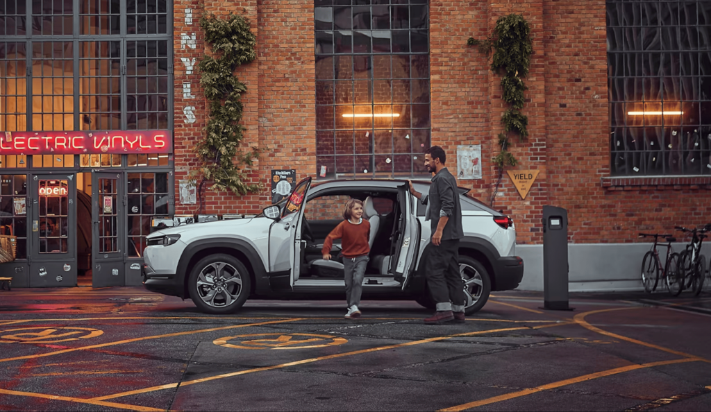 18palcová kola dostala jednoduchý květinový styl. Není to však jediná pozoruhodná věc, na kterou z profilu narazíme. Přední dveře například disponují tak samozřejmou věcí, jako je klika. Zadní, úzké, nikoli. Otevírají se opačným směrem, a i díky jejich velikosti je patrné, že Mazda MX-30 patří převážně do města.