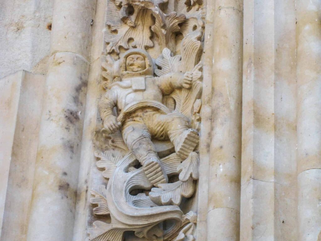 Katedrála Salamanca ve Španělsku se skládá ze dvou kostelů, z nichž starší pochází již z 12. a 13. století. Novější část byla postavena v 16. století, zatímco ta původní byla ponechána. Díky tomu vypadá stavba trochu zmateně a dochází zde k zajímavému míchání různých stylů. Co však na ní nezapadá ani do dvanáctého, ani šestnáctého století, je kamenný kosmonaut na fasádě. Ten je až hříčkou restaurátora z konce dvacátého století. Údajně to byla forma jeho originálního podpisu.