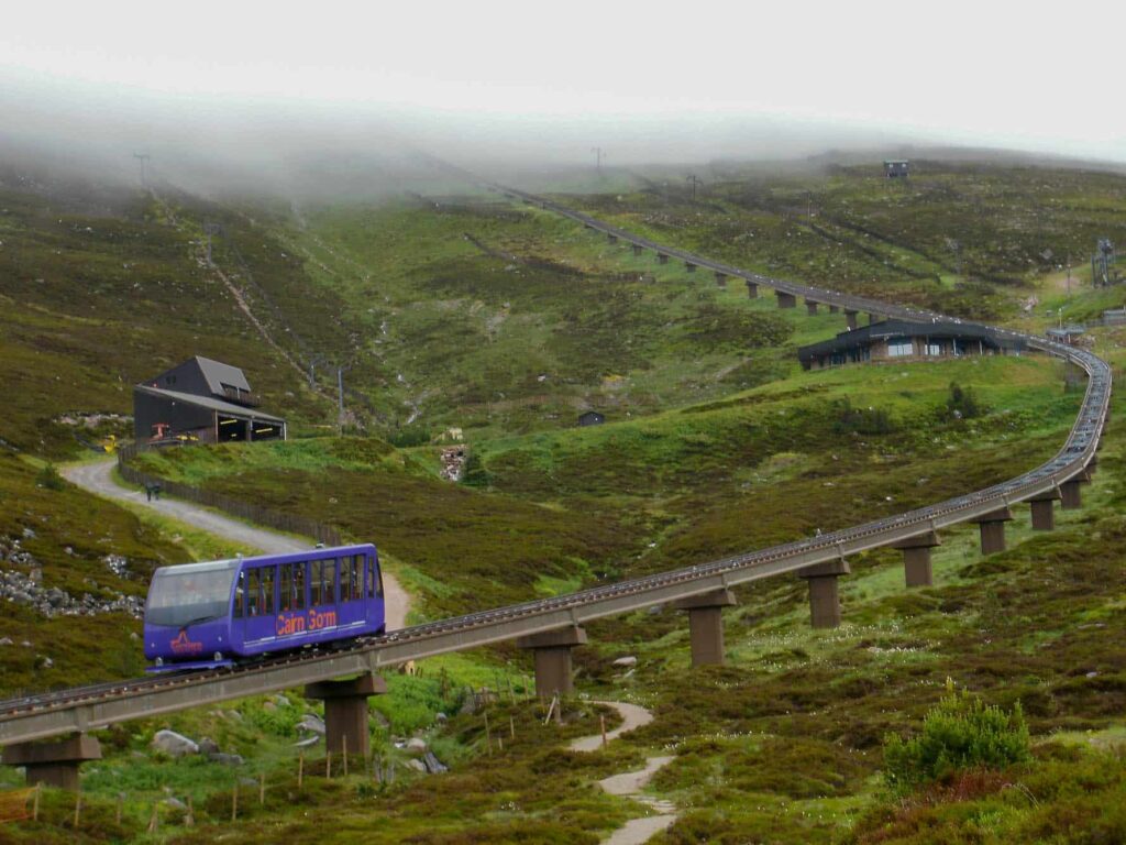 Lanovka spojuje základní stanici s restaurací a lyžařským areálem v nadmořské výšce 1 097 m na hoře Cairn Gorm poblíž Aviemore.