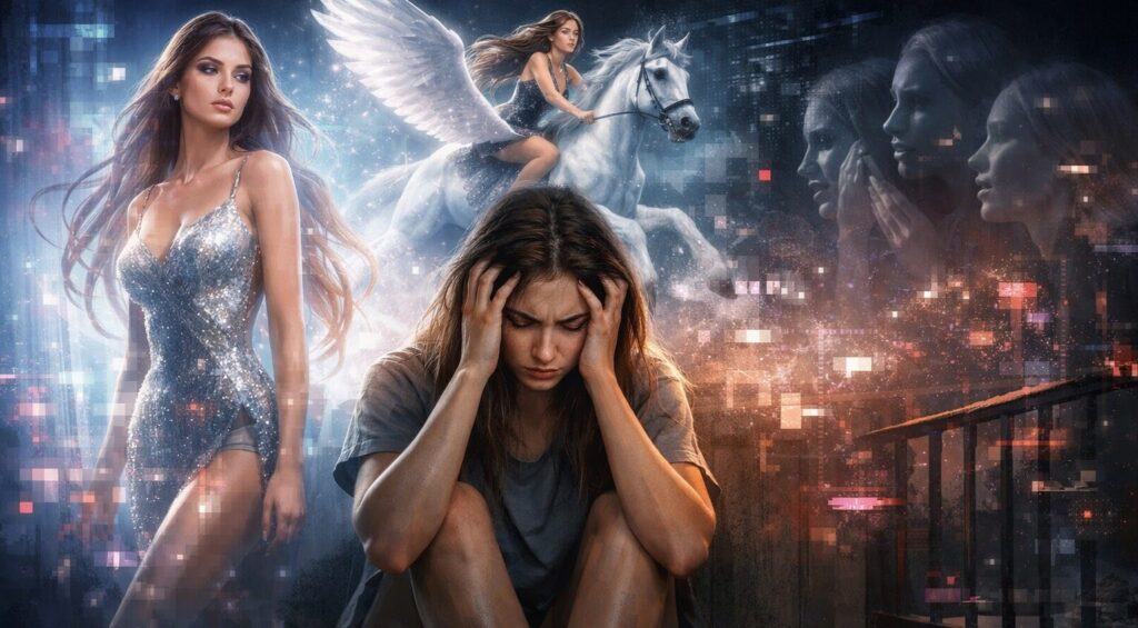 Postupně se podle ní měnilo i to, jak viděla samu sebe. Psala, že opakované sledování AI postav jí „začalo zkreslovat vnímání těla a přestimulovávalo mozek způsobem, který byl pro mé duševní zdraví opravdu škodlivý“. Když se generátory zlepšily a ubývalo groteskních chyb, vystřídaly je obrazy nerealisticky štíhlých, bezchybných lidí. „Vidět tyhle AI obrázky pořád dokola mi přepsalo, co považuju za normální,“ vysvětlila. „Když jsem se podívala do zrcadla, viděla jsem něco, co potřebuje opravu.“