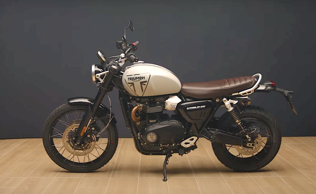 Klasický Scrambler v podání firmy Triumph. Přední část nás zaujme kulatým LED světlometem a pořádnou vidlicí. Cestou k zadní části se zastavíme u nádrže. Ta nabízí pohled na označení Triumph a část britské vlajky, která svou podstatou připomíná písmeno X. Výška sedla, jak jsme si už řekli, se snížila. Nově dosahuje hodnoty 820 mm. Dva vývody výfuku se drží těsně pod sedačkou a vytváří tak efekt tolik typický pro Scrambler.