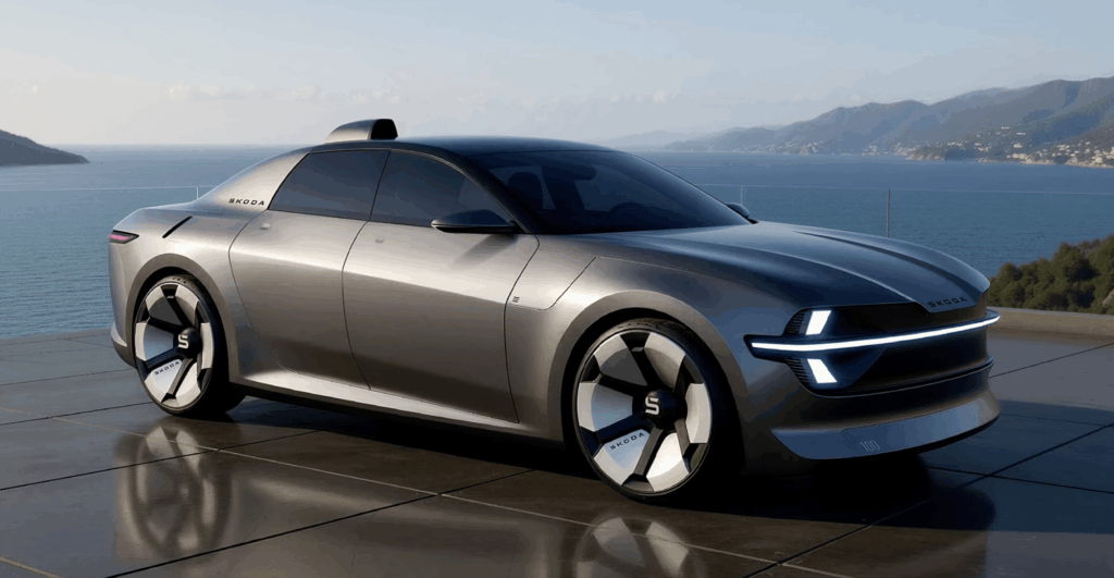V nejnovější kapitole se Škoda vrací k modelu 100/110, prvnímu vozu značky, který překonal hranici jednoho milionu prodaných kusů. Sedany vyráběné v letech 1969–1977, s motorem i pohonem vzadu, dnes ožívají jako čistě elektrická studie, byť jen v digitálním světě.