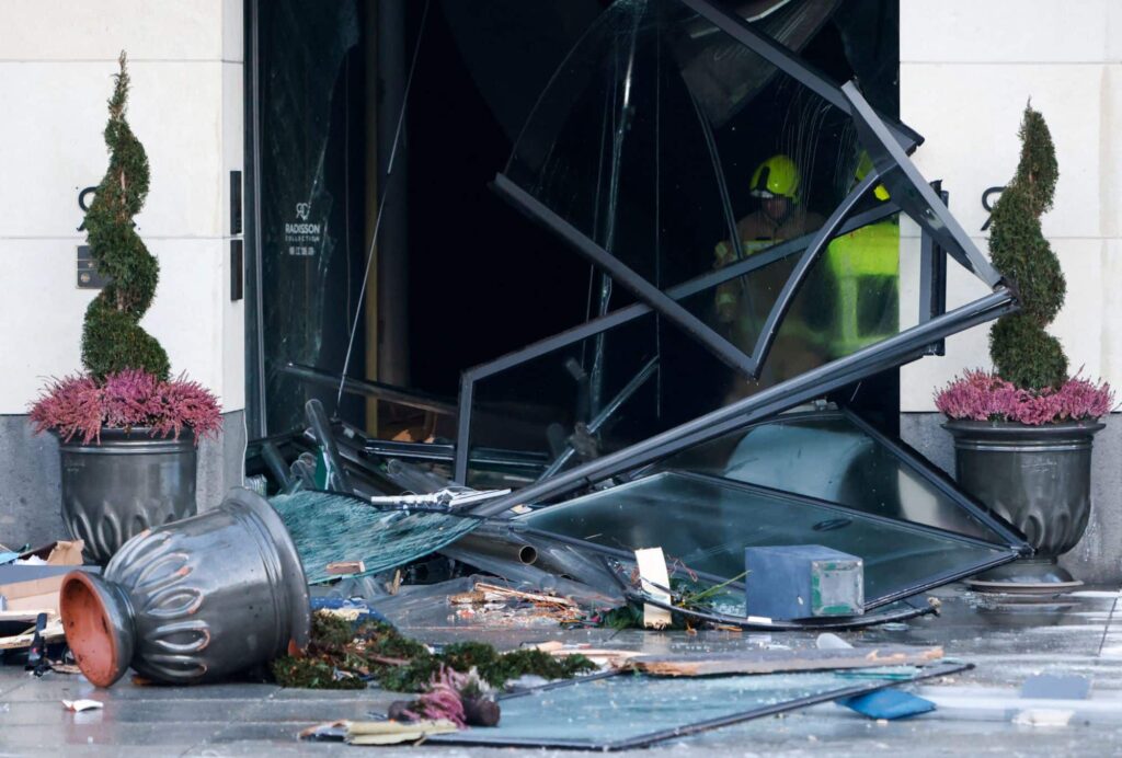 Před hotelem Radisson Blu ležela hromada trosek před bývalými vstupními dveřmi. Ty nyní visí do ulice, zkroucené pod úhlem vlivem síly explodující nádrže.